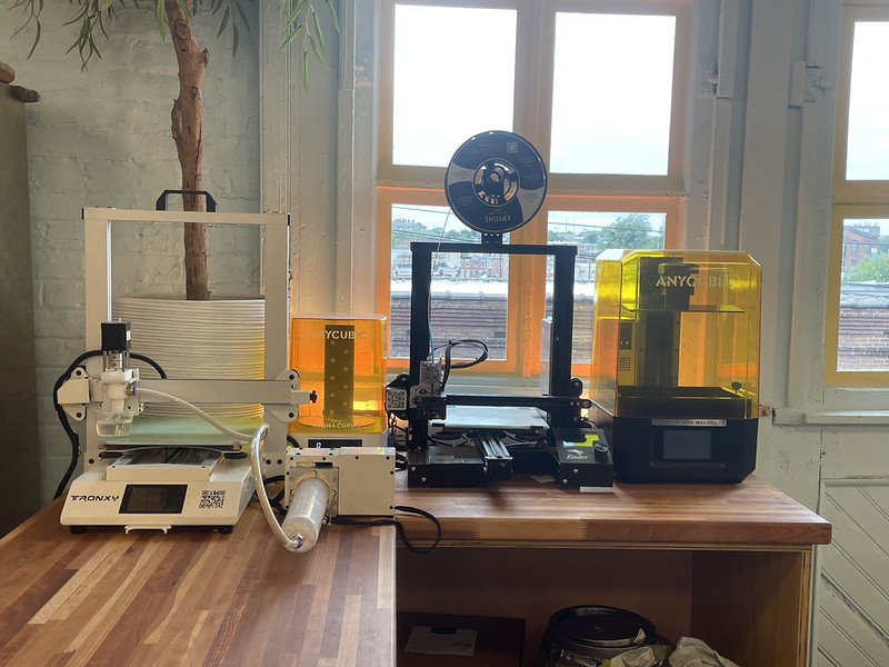 We have a FDM, resin, and clay printer, and each printer has a unique purpose. The FMD printer uses plastic filaments to create low-cost prototypes, tools, dies, and other objects where surface details are less important. The resin printer excels at creating highly detailed objects with resolutions measured in microns. It is excellent for detailed models, stamps, and chops, but each piece is more expensive to produce and there is a significant post-printing cleanup process. The clay printer creates your form directly in clay. This is a fairly new process and can be a little finicky, but once mastered, your pieces can go straight from printer to kiln.
