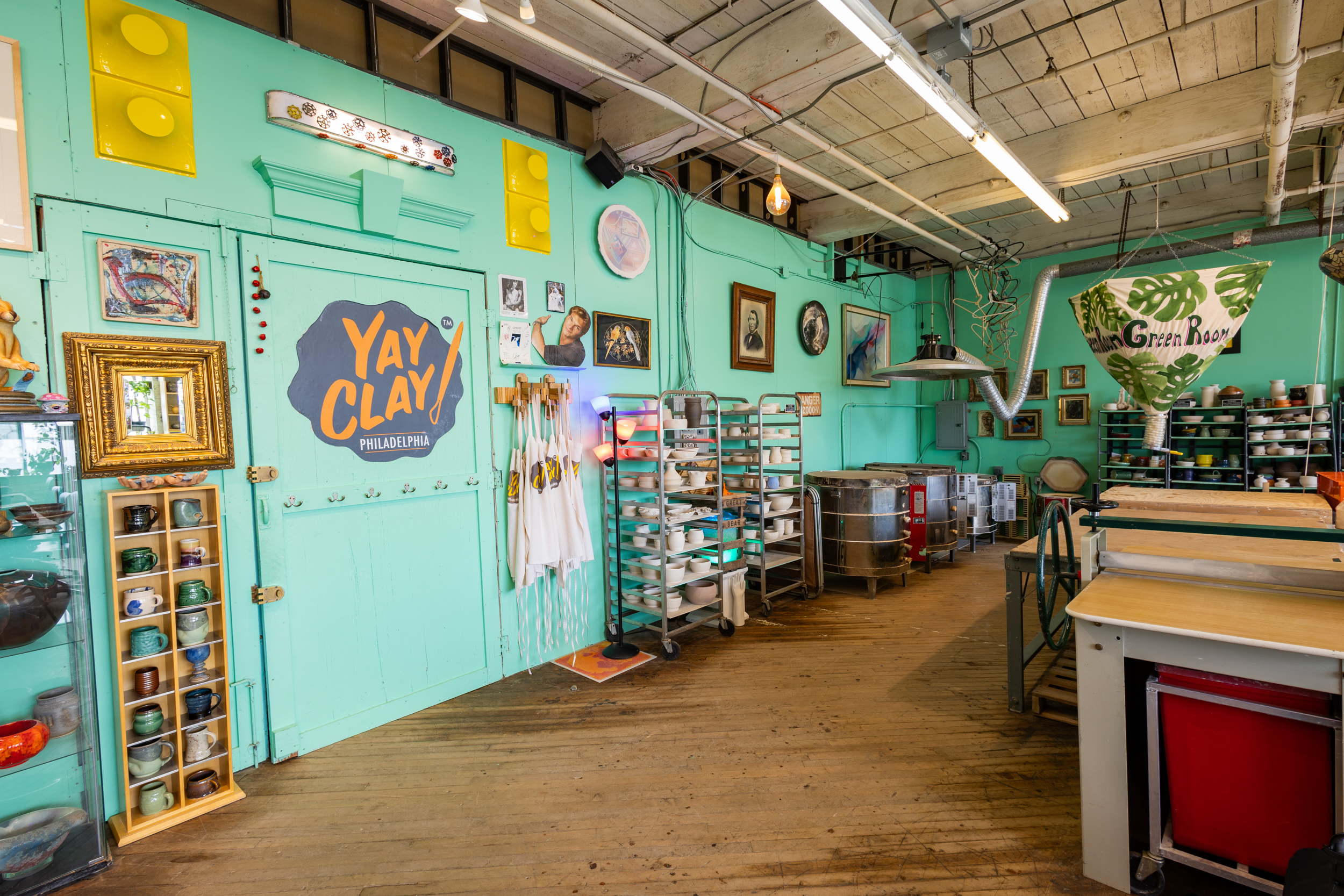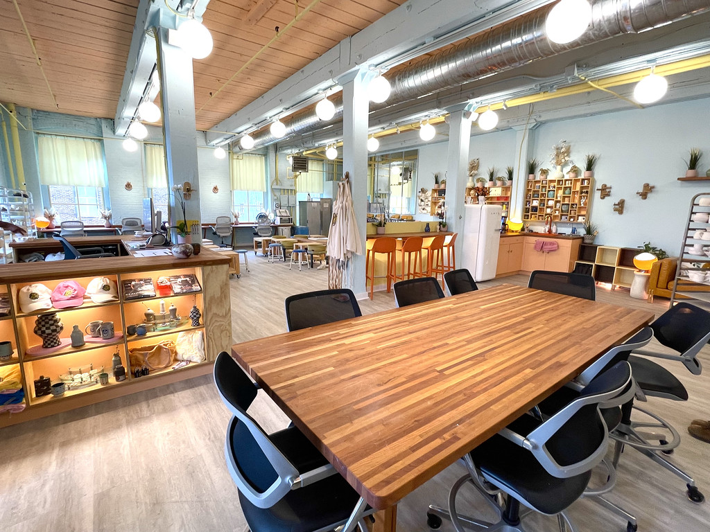 Embrace your inner artist in our original studio, the Green Room! Complete with 13 pottery wheels and chill vibes, it’s designed to be a creative haven for artists. This space is home to our classes, studio members, glazes, and kiln firings. Lush with plant life, and a ton of artwork by staff, students, members, and local artists, we hope you feel at home here!